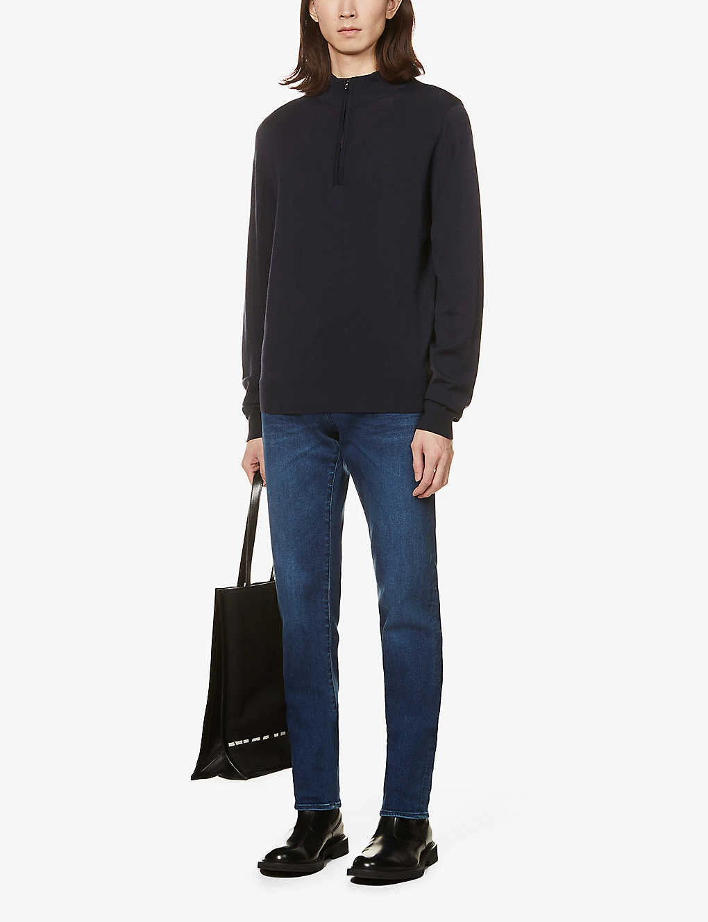 - Slim fit, mid rise, tapered leg, belt loops, five pockets, brand plaque at front, brand patch at back, exposed tonal stitching, faded wash and whiskering