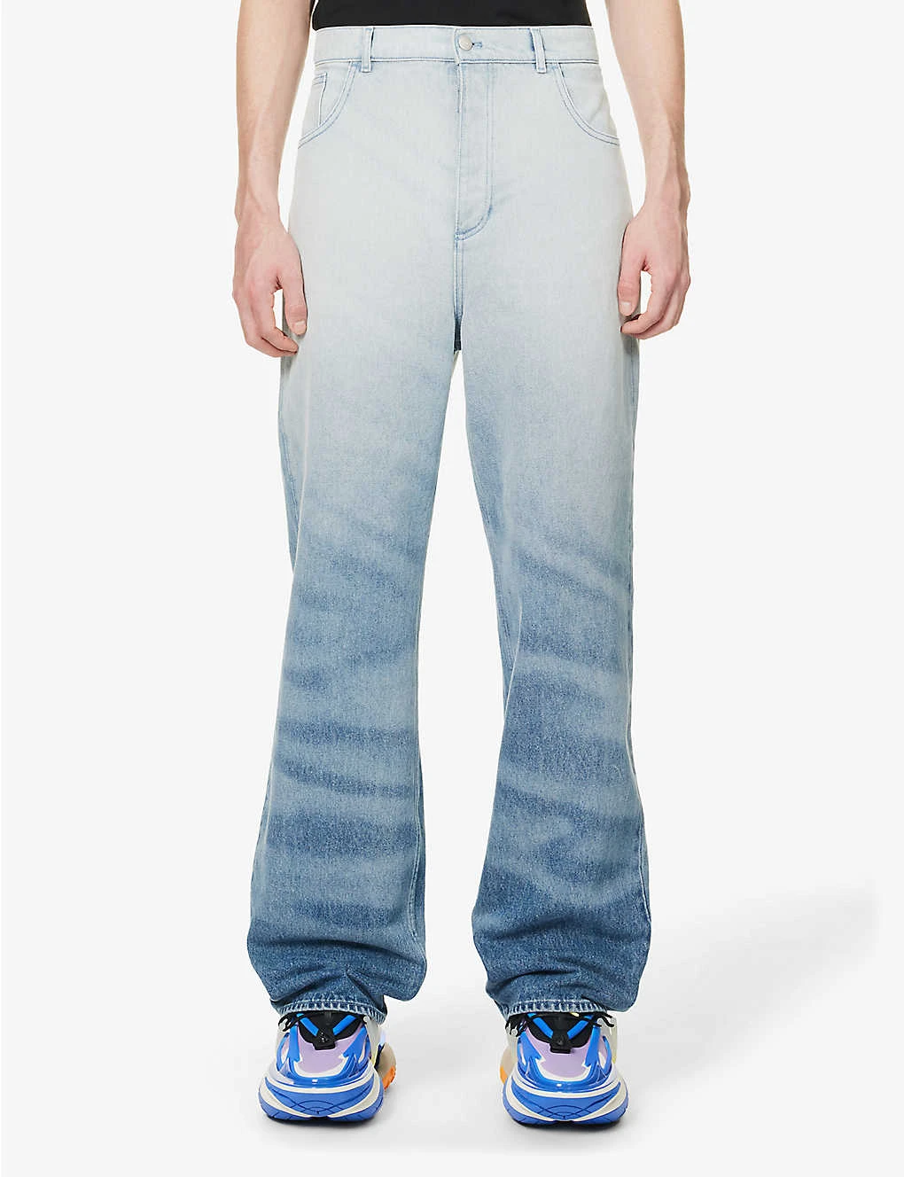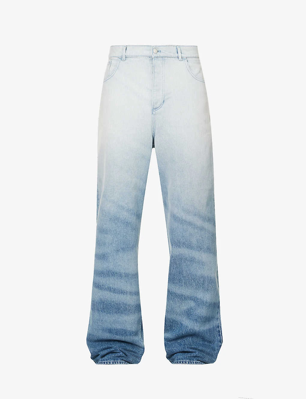 - Relaxed fit, mid-rise, wide leg, belt loops, five pockets, brand patch at back, rhinestone embellished branding at back, all-over faded design