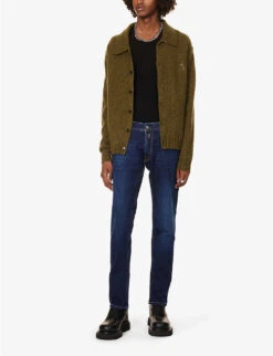 - Regular fit, mid-rise, tapered leg, belt loops, five pockets, brand patch at back, contrast stitching, branded hardware, partially lined