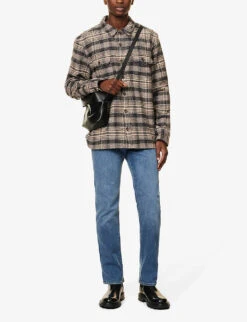 - Slim fit, mid rise, straight leg, belt loops, five pockets, brand plaque at front and back, brand patch at back, straight cuffs