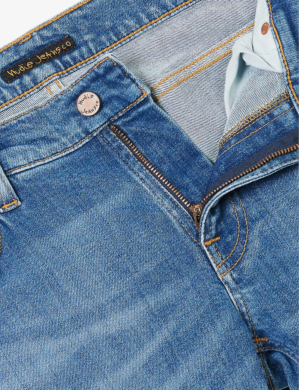 - Slim fit, mid-rise, tapered leg, belt loops, five pockets, branded hardware, brand patch at back, contrast stitching faded wash, partially lined