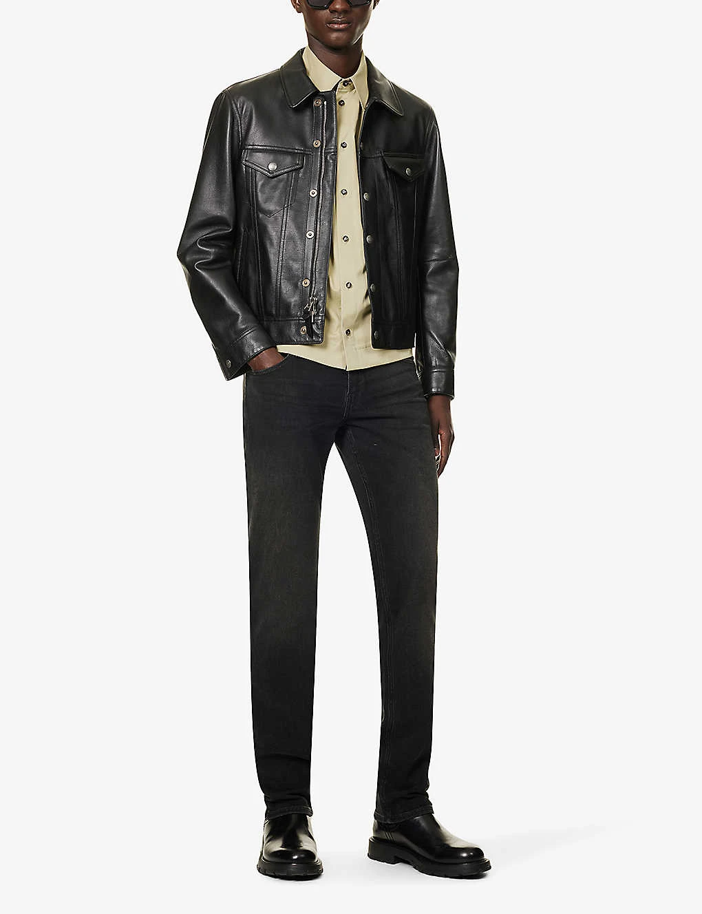 - Exposed button and concealed zip-fly fastening at front