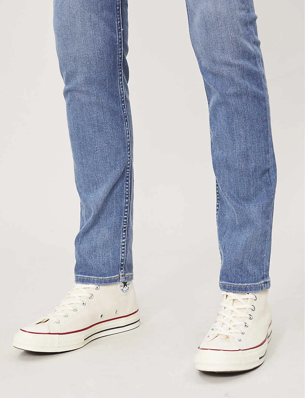 - Slim-fit, tapered, mid-rise, contrast stitching, belt loops, five pockets, faded wash and whiskering, branded hardware, branded leather patch at back waistband, V-shaped yoke at back, signature stitching detail at back pocket