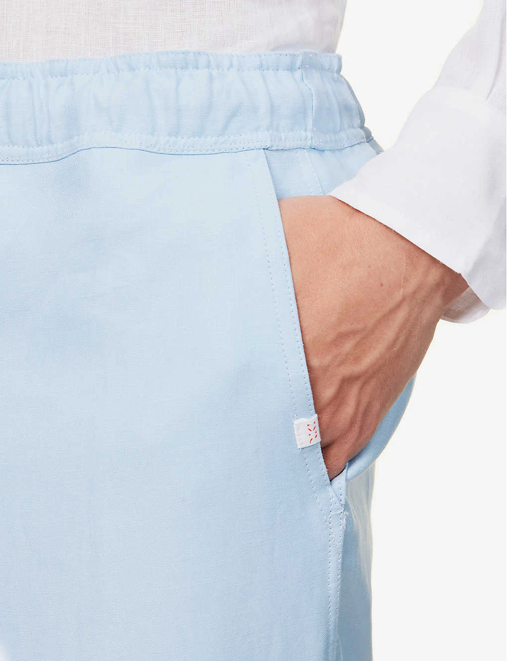 - Relaxed fit, mid-rise, straight leg, drawstring elasticated waistband, two slip pockets and brand tab at front, concealed zip fastening at front, zip pocket at back, pressed creases at front ad back, straight cuffs