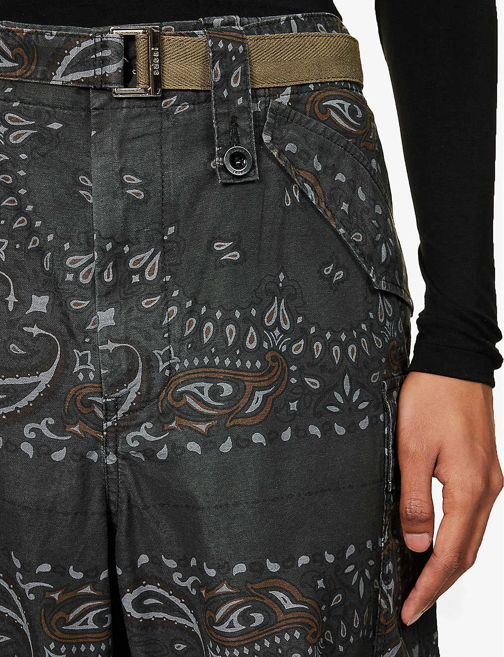 - Regular fit, mid-rise, wide leg, belt loops, buckle-belt at waist, four flap pockets at front, pleated knees, two flap pockets at back, contrast strap embellishments at back, branded hardware, all-over paisley pattern, partially lined, drawstring hems