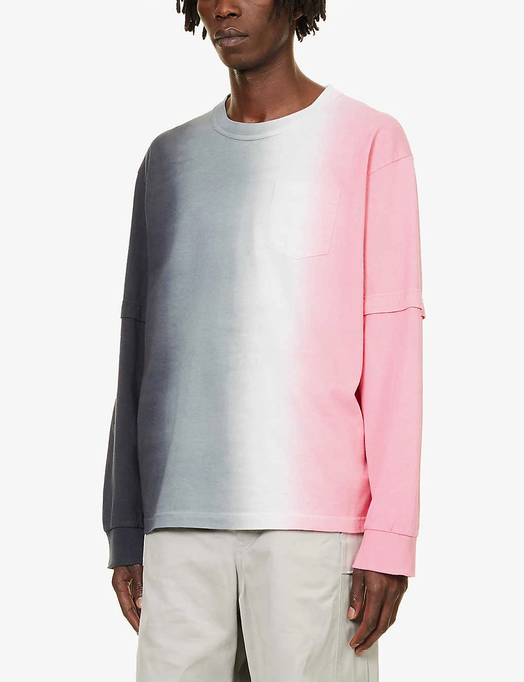 - Relaxed fit, crewneck, dropped shoulders, long sleeves, patch pocket at chest, brand print at back, gradient design, ribbed trims